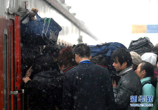 1月19日,杭州火车站几位旅客排队挤上回家的列车。新华社记者 鞠焕宗 摄