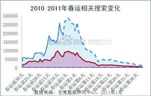 春运的脚步虽刚刚到来,但互联网上的“春运”却俨然已到高潮。近日,来自百度数据研究中心的一组统计数字显示,春运相关搜索已经屡创新高,最高日检索量更是突破了25万次,这一数据比2010年整个春运前后的最高日检索量高出2倍。同2010年春节比较,今年的春运也表现出了与以往不同的特征。