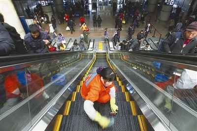 1月19日上午,记者在北京西客站看到,车站旅客较前几日明显增多,但秩序井然。车站工作人员随时待命。图为一位清洁工正在擦洗电梯,她说今年要加班回不了老家。记者 杨登峰 摄