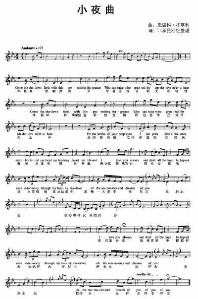 托塞利小夜曲乃世界名曲。我在大学期间,同学们经常吟唱,至今仍给我留下深刻的印象。绝大部分唱词我都能写得出来。但少数唱词只能哼其声而不能知其意。近几年我遍访京沪等地音乐学院、过去的老同学、老教授乃至九十几岁的周小燕同志,均未有结果。