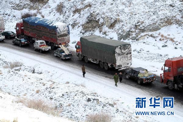 1月25日,新疆303省道哈密天山路段交通受阻,车辆排起了长队。当日,受冷空气影响,新疆哈密北部出现风雪天气,造成新疆303省道哈密天山路段路面结冰,交通受到影响。当地交通部门积极采取措施清除路面结冰、疏导交通,确保行车安全和道路畅通。新华社发(蔡增乐 摄)