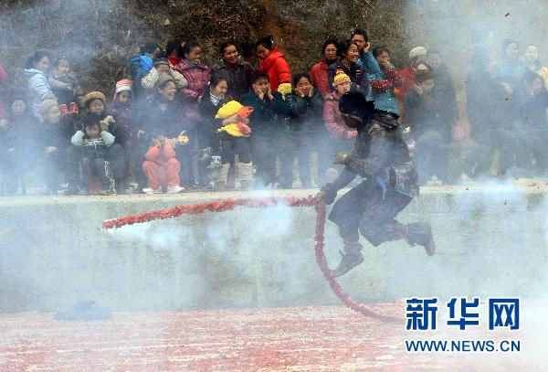 2月3日,在广西柳州融水苗族自治县安太乡寨怀侗寨老寨屯,一名“帽告”在拜年活动中放鞭炮。当日是农历正月初一,广西柳州融水县安太乡一带的侗族村寨举行传统“帽告”拜年活动,男性青少年脸蒙棕树皮扮成“帽告”,游街穿巷向村民拜年,给侗寨带来浓浓的节日喜气。“帽告”是当地传说中能给人带来幸福安康的吉祥神。新华社发(龙涛 摄)