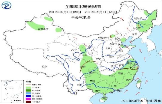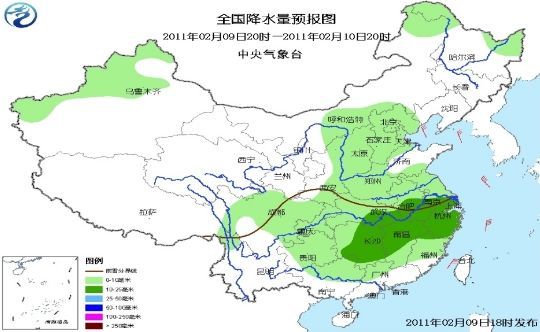 9日20时至10日20时,新疆西北部和天山地区、川西高原北部、陕西东部、内蒙古中部偏南地区和东北部、黑龙江北部、华北、黄淮西部和南部、江淮、江汉、江南、华南北部、西南地区东部等地有小到中雪(雨)或雨夹雪,其中,河南东南部、安徽大部、江苏中南部等地的部分地区有中到大雪(雨夹雪);内蒙古东部、东北、黄淮等地有4~5级偏北风;黄海大部海域、东海大部海域将有5~7级、阵风8级的偏北到东北风,台湾海峡将有6~7级、阵风8~9级的东北风。
