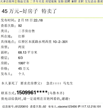 按照马先生的介绍,记者打开“天津百姓网”,在二手房出售的类别中,内容为“卖天津市红桥区本溪路永明西里某住房,45万元”,并注明“本人爹死了,要求卖房葬父!急卖!!!!”发布人:xiaoma123456,时间:2月11日22时18分,IP地址为117.12.218.191,留的联系方式是马先生的手机号,并注明是乌鲁木齐的手机号。