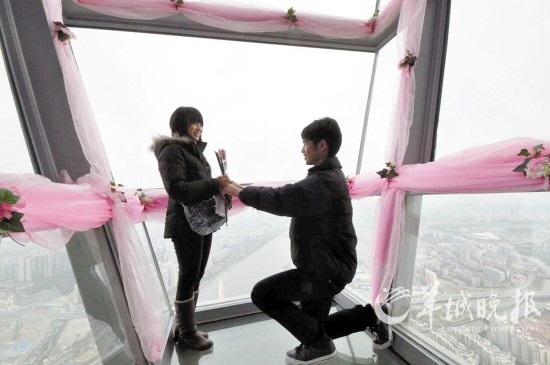 14日是情人节,下午3时半,一位男士在广州塔第107层突然掏出钻戒,向正在俯瞰花城风光的女友求婚(图)。