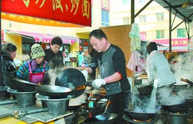 刚刚走进三好美食街的大门,就能听见丁丁当当的有节奏的勺子摩擦大勺的炒菜声,夹杂着偶尔出现的叫好声。大勺哥郑建安被围在长长的排队人群内,透过人群,只见12个炉灶围着他并排摆成一圈,一个个炉灶摆上大勺紧紧挨着。