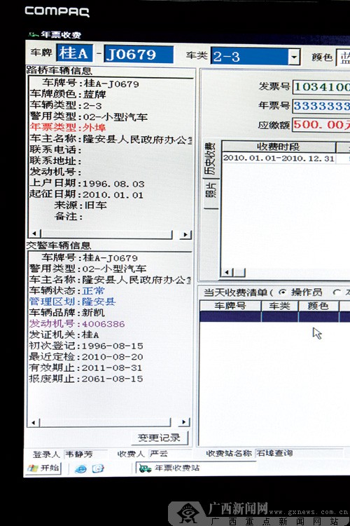 收费站的信息系统显示,轿车车主为“隆安县政府办公室”。陶海华 胡志伟摄