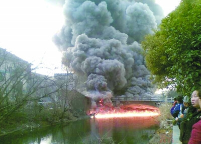 火灾发生后,水面漂浮着大量易燃物,大火将一座小桥烧毁