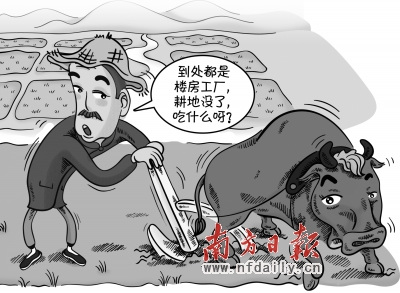 但是,昨日新华社发布消息,全国人大农业与农村委员会近日审议《发展改革委关于落实全国人大常委会对国家粮食安全工作情况报告审议意见的报告》时透露,随着近几年城镇化进程的加速,房地产用地和企业用地不断扩张,耕地一再受到侵蚀,目前中国耕地面积仅约为18.26亿亩,比1997年的19.49亿亩减少1.23亿亩,中国人均耕地面积由10多年前的1.58亩减少到1.38亩,仅为世界平均水平的40%。18亿亩耕地红线岌岌可危。