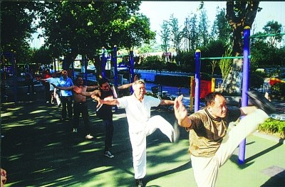 走进任师傅的家,简直是一个家庭健身房。“因为每天都要锻炼3个小时左右,有时候天气不好实在不想出去,就逐渐在家里打造出很多的健身器材。”因为住一楼,院子自然成了主要场所,高高低低的双杠、单杠就有三四组,石锁,哑铃等等也能放成一小排。“家里主要就放点瑜伽垫子、臂力器,还有拳击用的训练设备”。对拥有一个“施瓦辛格”般健壮的大力士形象是时下不少年轻男士的目标,逸仙桥却有支平均年龄超过60岁的老年健身队,几乎个个练就一身健美身材。他们不仅一身肌肉,更有着各种玩单杠、双杠的绝活,最厉害的能单手举起80公斤石锁。