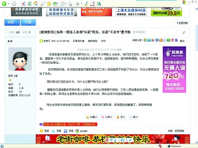 一名在沈海高速如皋服务区内做保洁的女工,深夜捡到一个钱包后没有上交,而是带回家。根据监控录像,交警带着失主找到清洁工后,清洁工将装有近2万元现金和重要证件的钱包交还失主,并谢绝了酬谢。但此后,这名清洁工所在单位却以“还款不及时”为由,将其开除。该女工感觉自己很冤,“好事难道做不得?”而服务区相关人士则称是按规定办事。孰是孰非,双方各执一词,并在当地引发众多议论。