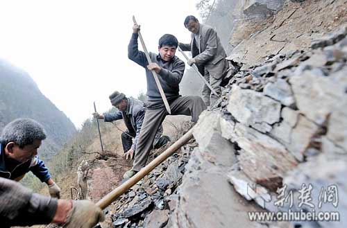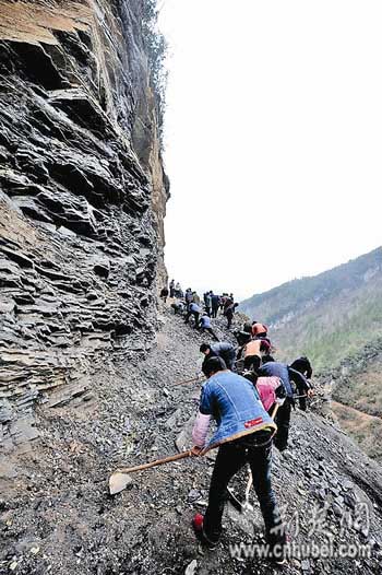 昨日11时17分,爆破声后,碎石和粉尘缓缓落定,高山深谷阻隔的建始县龙坪乡店子坪村再次回到宁静中。村支书王光国和60多名村民回到百米高的悬崖上,锄头、钢钎和劳动号子又响了起来。