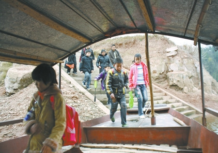 每天中午或傍晚,山路上飘来银铃般的欢笑声,准是孩子们放学了。他们把船停稳,然后到岸上一个一个接孩子们上船。