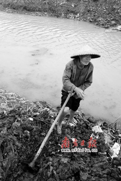 2月26日,雷州东洋灌区,城内电灌一站旁,开阔的农田中,乡亲们正在为春耕忙碌。头戴蓑帽、68岁的何世振赤脚踩在污泥和垃圾充塞的河道里,一脚深一脚浅地将被掩埋的排水管挖开。
