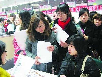 昨天的这场招聘会是女大学生专场,虽然并不阻拦男生入场,但记者在现场看到,前来应聘的基本上是清一色的“娘子军”,尽管偶尔也能看到男生的身影,但一问才知道,他们几乎都是来“打酱油”的。男生小吴就是其中一位,“我就是帮女朋友来投简历的,”他告诉记者,女朋友临时有事来不了,于是就托他代投。而另一位男生周同学则显得有点窘迫,笑着对记者坦称“鸭梨很大”:“起初我并不知道是女生专场招聘会,在路上听同学说有招聘会,就回学校拿了几份简历赶过来。结果进门一看就傻眼了。”不过好不容易来了一趟,小周还是顶着“鸭梨”在招聘会场转了一圈,“我学的是市场营销,总共投了三份。”