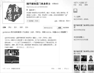 记者发现,目前此微博的粉丝已经有1200人,通过该微博求解决的单身男女都是80后,甚至还有一位1993年出生的在校女生。
