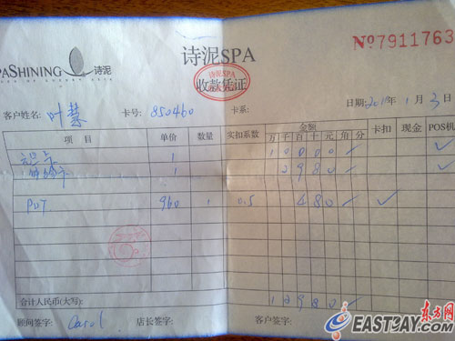 叶小姐是位于浦东金桥商业中心的诗泥SPA会所的老顾客。去年底,美容顾问向她推荐了一种PDT光能靓肤疗程,“据称是通过红蓝光谱的照射,加快皮肤真皮层细胞代谢能力,促进胶原蛋白再生。”叶小姐说,自己当即对这个陌生项目的效果表示怀疑,但对方称保证安全、无副作用,并称可以对折价格预约体验一次。考虑到这家SPA会所在上海有多家门店,“应该比较有实力”,叶小姐就动了心,当即支付了480元的体验款。