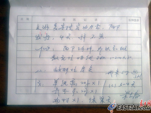 图片说明:东方网记者在病历卡上看到,医生诊断为接触性皮炎。