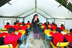 当日,云南省盈江平原镇岗勐中心小学震后正式复课。在成都军区某师官兵的援助下,军用帐篷如期搭建好,四五年级的同学们坐在帐篷教室里朗朗读书。这次地震使该学校基本被毁,所有教学楼都被震成危房。幸运的是,由于平时经常进行逃生演练,学校300多名学生、老师无一受伤。新华社记者 秦晴摄