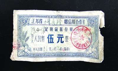 记者看到,该存单比成年人的两根手指稍宽,与当时发行的粮票大小相似,存单抬头是“江苏省太县梁徐乡信用合作社”,公章为“泰县梁徐乡蒋黄信用服务站”;中间两行字,上面一行是“限4个月定额储蓄存单”,下面是“存入人民币5元整”,存储时间为1958年4月30日。陈余胜76岁的老母亲蒋粉英告诉记者,春节前,她在家中一个小本子里翻到了一张存单。蒋粉英回忆说,存单是她的丈夫陈友荣当年存的,后来一直找不到了。丈夫曾在梁徐乡供销社炕房工作过,去世已经10多年。