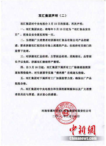 声明还称,自3月16日起,双汇集团下属所有工厂除继续按照国家标准检验外,对生猪屠宰实施“瘦肉精”在线逐头检验。