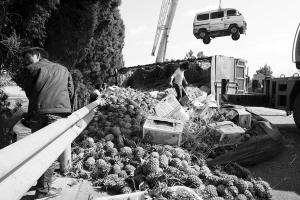 得知出了交通事故,附近不少村民跑来看热闹,有些村民发现出事的车上拉的是菠萝,便打起了主意。有的村民拿着塑料袋、编织袋来到路边,趁警察和车主不注意,把菠萝装进口袋;有的带着孩子来拿,拿够之后扬长而去;甚至有人坐在路上边削边吃,吃完再用衣服包上几个离开,路边的栏杆下全是菠萝皮。担心村民哄抢菠萝,一名交警赶紧出面制止。