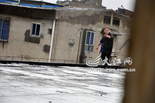 昨日下午4时许,记者赶到广场北路珠山区疾控中心办公楼的7楼楼顶,只见一名身穿黑色上衣的男子在楼顶平台走动,不时还用一把小刀割自己的右手臂。记者看到,男子的一双手臂已经血肉模糊。