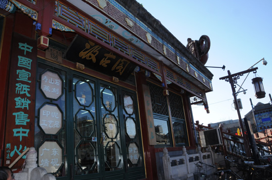 闻名中外的京城琉璃厂文化街,位于现在北京的和平门外,西至宣武区的南北柳巷,东至宣武区的延寿寺街,全长约800米。琉璃厂有许多著名老店,如槐荫山房、古艺斋、瑞成斋、萃文阁、一得阁、李福寿笔庄等,还有中国最大的古旧书店中国书店,以及西琉璃厂原有的三大书局——商务印书馆、中华书局、世界书局。
