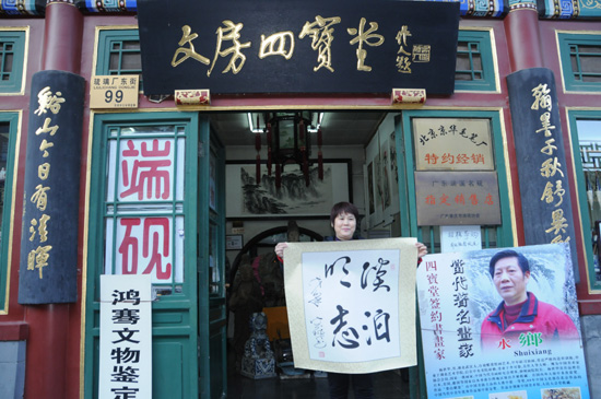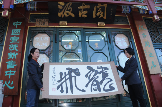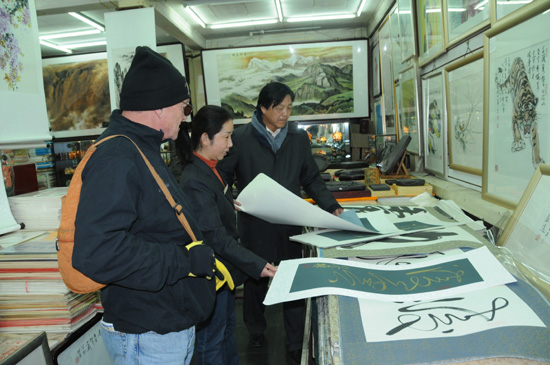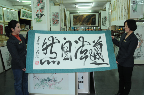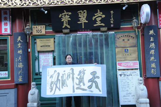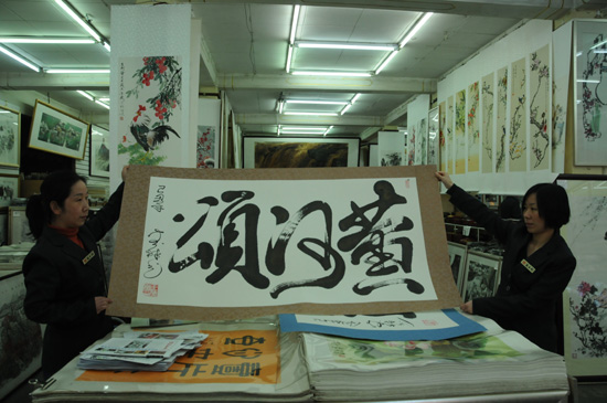 店员听说要看王德林先生的作品,马上从不同的柜台上拿出许多风格各异榜书条幅。据汲古阁经理介绍,德林先生的作品在这里卖得很好,是因为书法独特,独步国内,受到国内外书法爱好者的欣赏和喜爱。许多顾客第一次看到德林先生的榜书书法作品,都觉得眼前一亮。不少人成了回头客,专门到这里购买德林先生的书法,而且对德林先生本人的经历和书法创作过程也很感兴趣。