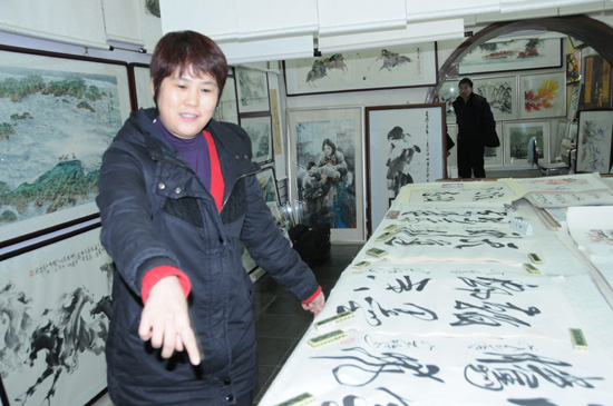 恰逢在北京做生意的赵女士来到这里专门挑选王德林先生的作品。当她意外地在此与德林先生本人相见时,惊喜万分。她激动地说:“我第一次看到德林先生的榜书作品时,就被强烈地震撼和深深地吸引住了。他的作品中透出一股大江大河般的磅礴大气,我虽然没有机会与王先生谋面,但从他的作品中能感受到他的人格魅力。”