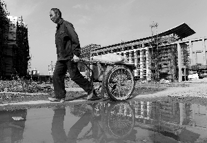 一名建筑工人拉着翻斗车在办公楼工地前走过。新华社发