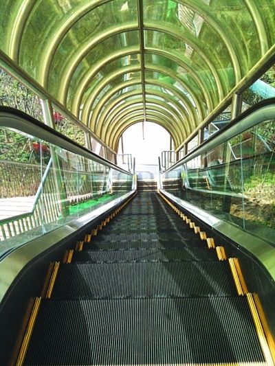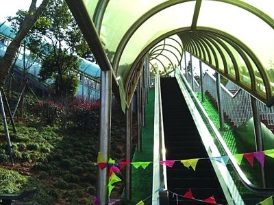 走进园内远远望去,在半山腰处有一段蓝色弯曲的圆筒状物,像一条龙一样蜿蜒而上。一名学校老师告知记者那就是“翻山”电梯。走了一段路后,记者来到山脚下,发现电梯入口处已经用彩旗拉起隔离带,电梯已经停运。保安说电梯出了故障在检修。记者发现,这是一种与商场、超市一样的手扶式电梯,宽约1米,为了遮风挡雨,电梯上面的空间被封了起来,像是走廊一样。由于电梯关闭,记者无奈步行,顺着电梯旁的楼梯往上走。这是一种分级电梯,每上一级有一个平台,通过平台后再上第二级、第三级。记者仔细数了一下,上山的电梯有3级,下山的电梯有2级,每一级相当于一层楼高。从山上望下去,电梯还是有点陡。一圈爬完后,记者的大腿有些发抖。