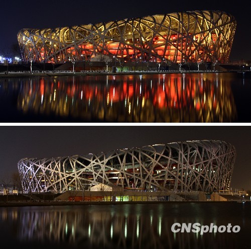 2010年3月27日晚8:30-9:30,“地球一小时”活动期间,国家体育场“鸟巢”关闭景观照明,号召人们关注气候变化带来的挑战。 中新社发 余明 摄