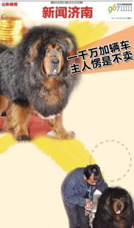 “我出1100万再加上一辆好车,你把狗卖给我吧。”“不行,我这藏獒大概价值2000万呢!”近日,“2011年全国第二届精品藏獒交易博览会”在济南长清区滨湖大道园博园国际会展中心举行,全国的顶级藏獒血系以及全国百强獒园率领幼獒军团集聚山东,其中几条价值数千万的藏獒,更是吸引了众多养狗爱好者和普通市民的强烈关注。