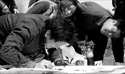 我们挤进去,只见一40多岁男子耳孔里夹着一支毛笔正在白纸上写字,双眼却看着一侧的雪松。