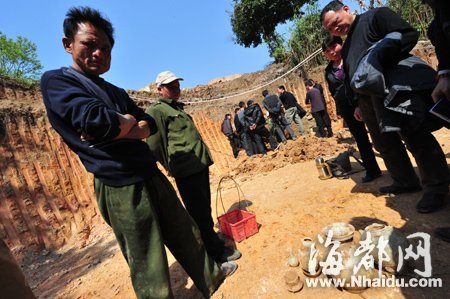 闽侯一村民在拓宽自家后院时,挖出一座古墓,并发现多件随葬瓷器,部分赶来看热闹的村民竟哄抢随葬品。昨日中午,省考古队和闽侯县博物馆工作人员赶去保护现场,初步断定墓葬年代为唐朝,并计划进行抢救性发掘。