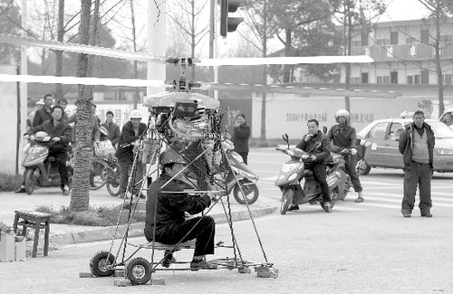 昨日,又一架手工打造的“土飞机”出现在双桥子一座工地上。它的顶部是双层反向螺旋桨,桨柱下面,有两台摩托车的发动机。下方则是用拇指粗的钢管焊接起来的“机舱”,形似鸟笼。一只摩托车的把手垂在“机舱”里,据说是用来启动发动机并控制螺旋桨方向的。