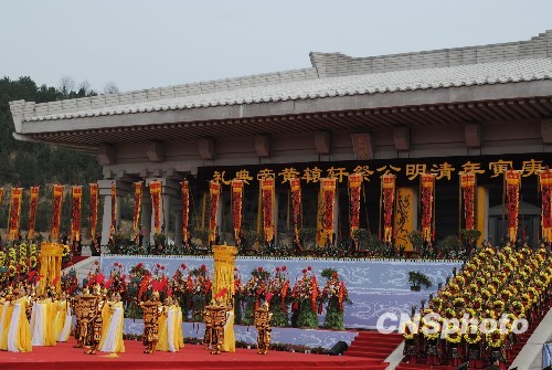 资料图:2010年(农历庚寅年)清明节,万余名海内外华人代表齐聚陕西黄帝陵祭祀大殿前,共同拜祭中华民族的人文始祖轩辕黄帝。图为4月5日,乐舞告祭的场景。 中新社发 冽玮 摄