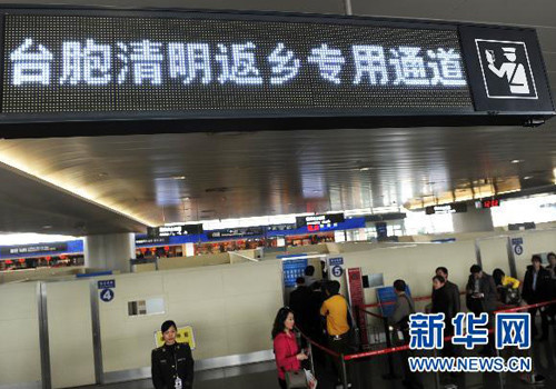 4月1日,旅客在“台胞清明返乡专用通道”排队办理通关手续。(图片来源:新华网)