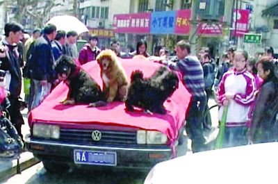 昨天中午12点,记者接到读者报料赶到现场,发现长白街和大石坝街交叉路口早围满了看热闹的市民。一辆青海省西宁市牌照的红色桑塔纳停在路口,车顶上铺了一层红色布毡,7只小“藏獒”被一溜摆放在车顶上。4名男子操着不太地道的普通话,正在卖力地向路人作推销。