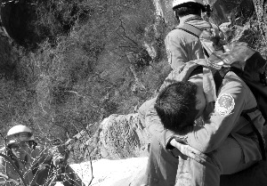 前日,救援人员把被困人员带到直升机下等待救援。记者 王贵彬 摄