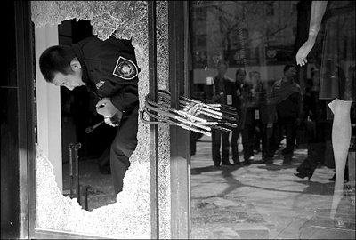昨天上午,记者在被砸的一家女装店门前看到,钢化玻璃门被砸出一个大窟窿,但门上4把锁未被撬开,门前还留有几块碎裂的砖头,地面上布满了钢化玻璃碎片。为了保护现场,店内工作人员从被砸出的窟窿进出。其余3家店则均只上了一把锁,全被撬坏。据了解,4家店丢失的财物包括一台价值3000多元的数码相机和5000多元现金。