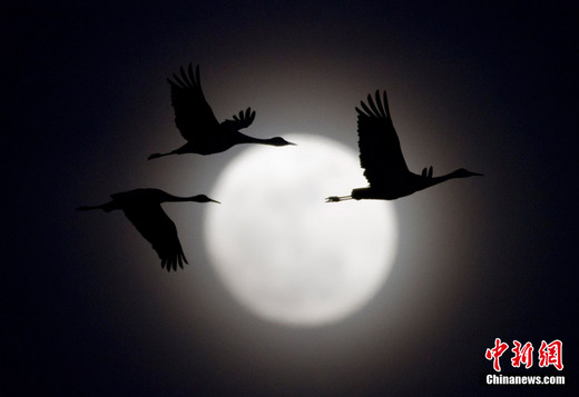 资料图:2011年3月18日,美国内布拉斯加州,沙丘鹤飞过升起的月亮。美国航空航天局发布消息说,19日,月球将到达19年来距离地球最近位置,它与地球的距离仅有35万多公里,从地球上观看,月球比远地点时面积增大14%,亮度增加30%,号称“超级月亮”。