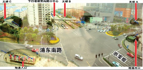 俯瞰浦东南路张杨路路口,周边商场林立,3座天桥,一条地道独立分布,行人斜穿路口需要爬2座天桥,且其中一座的下行楼梯背向路口中心。