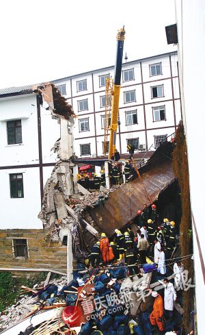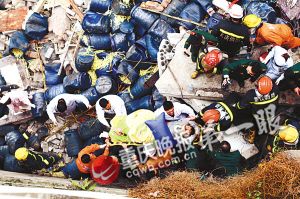 昨日(12日)是九龙坡区走马镇赶场天,一辆外地牌照的大货车行至走马老街下坡拐弯处时,径直冲向公路左侧民房,将民房部分楼面撞毁,车头陷入楼房地下室。由于报警电话称车内有7人被困,包括九龙坡区政府、公安、安监、卫生、消防等部门及时赶到现场救援。