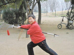 任大娘目前学了两套关公大刀刀法。电视里放的关公的拖刀刀法,暂时还没有学。其他如“腰斩”、“回头斩”什么的,任大娘都会。最关键的是,一套刀法舞下来,任大娘不喘气,虽然有些慢,架子有些高,但对68岁的老人来说,真的不容易了。