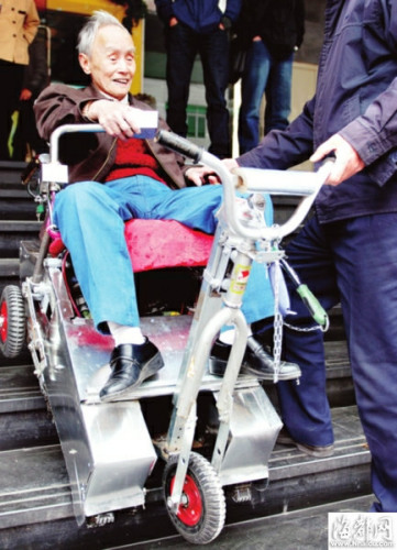 记者看到这辆电动多功能上下楼梯车长约1.2米,宽约0.8米,主要由轮椅和履带组成,就像一张残疾人坐椅搭在了一袖珍坦克的履带上。正在演示的老人叫张瑞钧,是一名83岁的老科技工作者。他告诉记者:“发明这辆轮椅花了十多年,几经改进才研制成功,还取得了国家专利。”据了解,当年张瑞钧因为一位残疾朋友上下楼梯都要靠人背,自己痛苦,别人费劲,这才触动他研发上下楼梯代步工具,他说,残疾人朋友有了这种车,这一难题将会迎刃而解。
