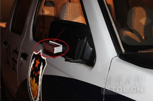 另一辆警车反光镜上绑着的火柴盒(记者李景辉摄影)