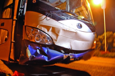 大客车前脸被撞瘪,挡风玻璃破碎。