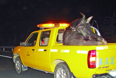 昨天下午,一头刚刚被牛贩收购回来的大水牛,在镇江句容市郭庄镇朝阳大队顶伤5人后,又不顾阻拦窜上了宁杭高速二期逆行向南京溧水方向跑去,3名持枪追击武警准备对其实施击毙时,水牛却迎面与一辆湖南籍大客车迎面相撞,大客车前脸被撞瘪、挡风玻璃破裂,而这头600公斤左右的大水牛也因车祸当场毙命。